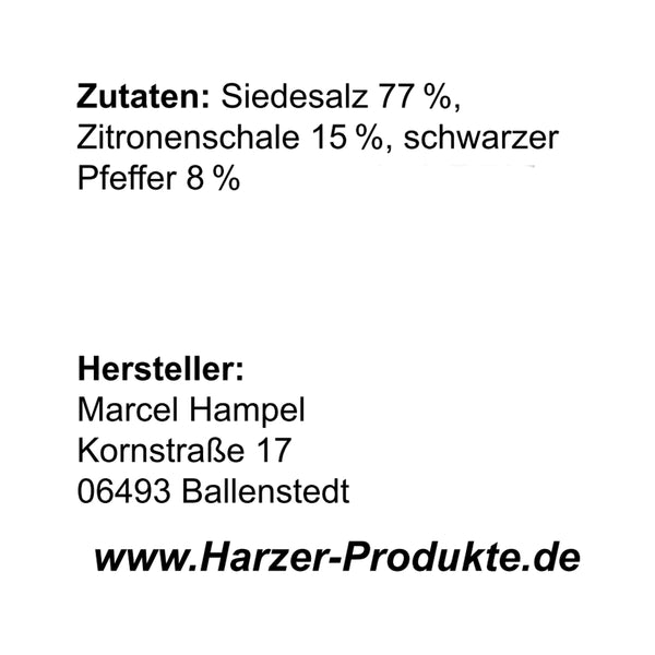 Zutaten: Siedesalz 77%, Zitronenschalen 15%, schwarzer Pfeffer 8%, Trennmittel: E 535