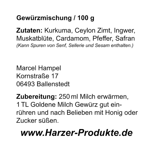 Zutaten: Kurkuma, Ceylon Zimt, Ingwer, Muskatblüte, Cardamom, Pfeffer, Safran