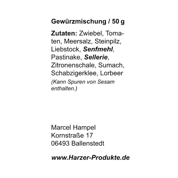Zutaten: Zwiebel, Tomaten, Meersalz, Steinpilz, Liebstock, Senfmehl, Pastinake, Sellerie, Zitronenschale, Sumach, Schabzigerklee, Lorbeer